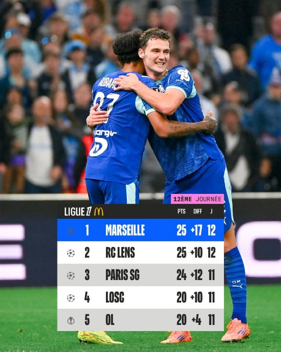 2025-26赛季前12轮,大巴黎以27分暂居榜首,但仅领先第二名马赛和第三名朗斯2分(25分),第四名尼斯24分。这是近5年同期最小分差,而上赛季大巴黎曾以领先第二名24分的优势提前6轮夺冠。